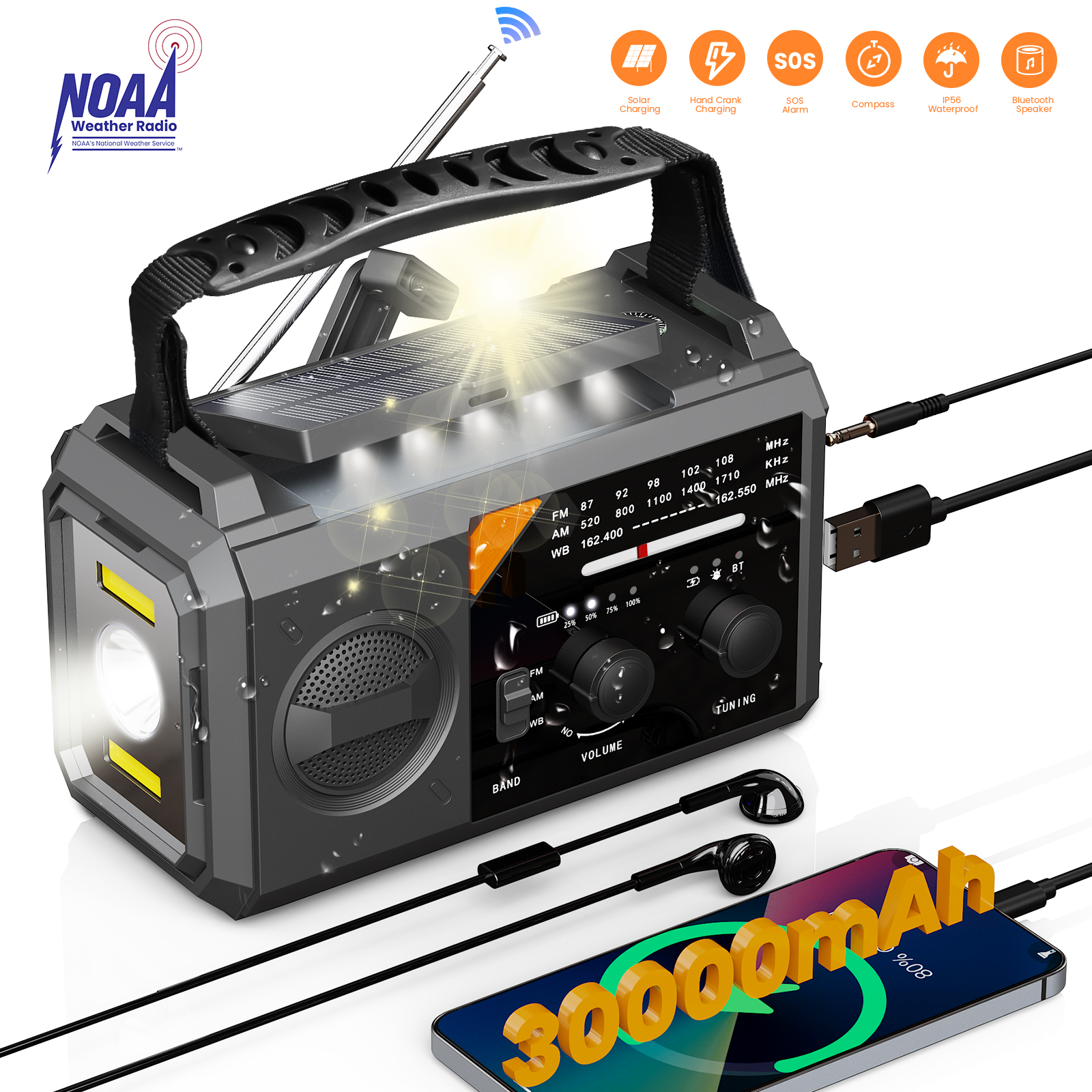 AUOSHI 30000mAh Weather Radio, NOAA/AM/FM Emergency Radio with USB/Solar/Hand Crank Charging, Flashlight, SOS Alarm, Compass, Battery Operated for Hurricane Preparedness, Gray