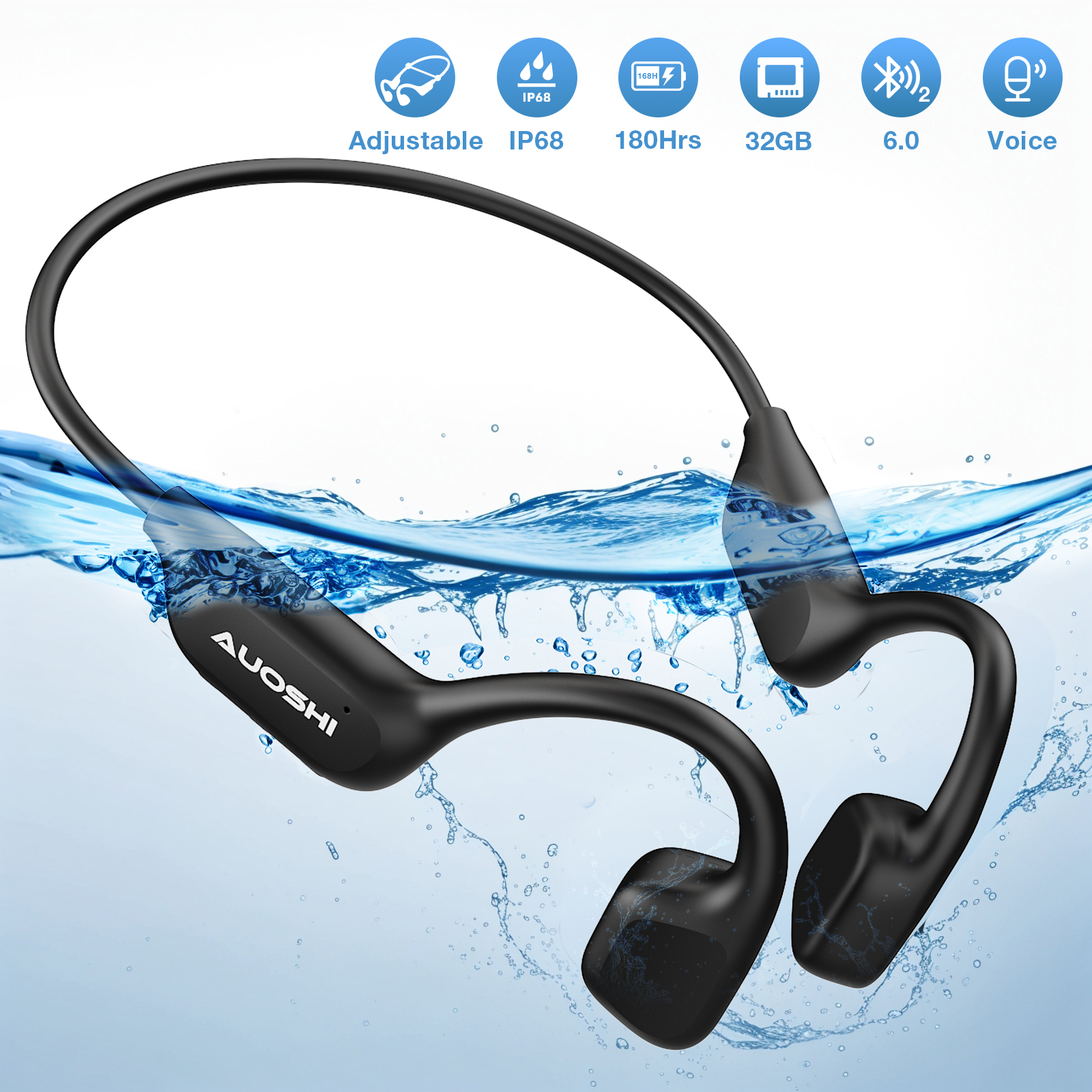 AUOSHI IP68 Waterproof Open Ear Bone Conduction Headphones, Wireless Bluetooth 5.3 Headset with Built-in 32GB Music Player, Underwater Sports Headphones for Swimming,Running,Cycling Workout Gym,Black