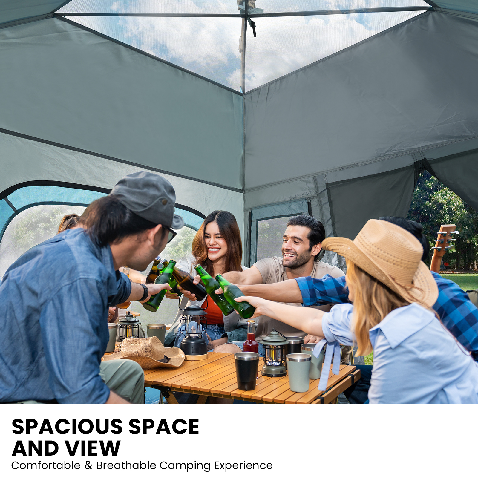 Spacious Interior: At 85″*85″*55.2″(215x215x140cm), it comfortably accommodates 4-6 people. Dual-entry mesh doors and 4 enlarged mesh windows offer easy access, airflow, and scenic views.