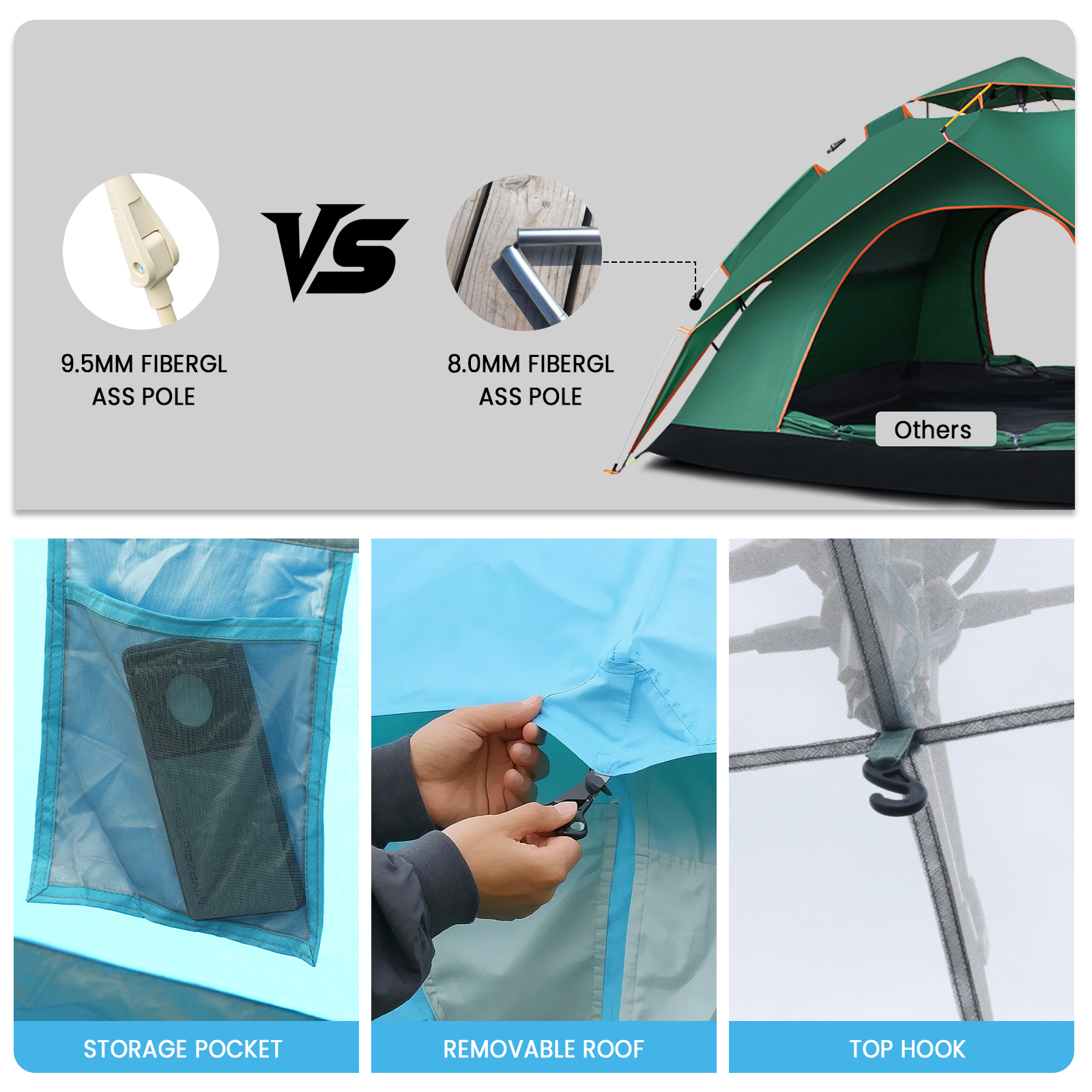Frame: 9.5mm Fiberglass Auto Poles.