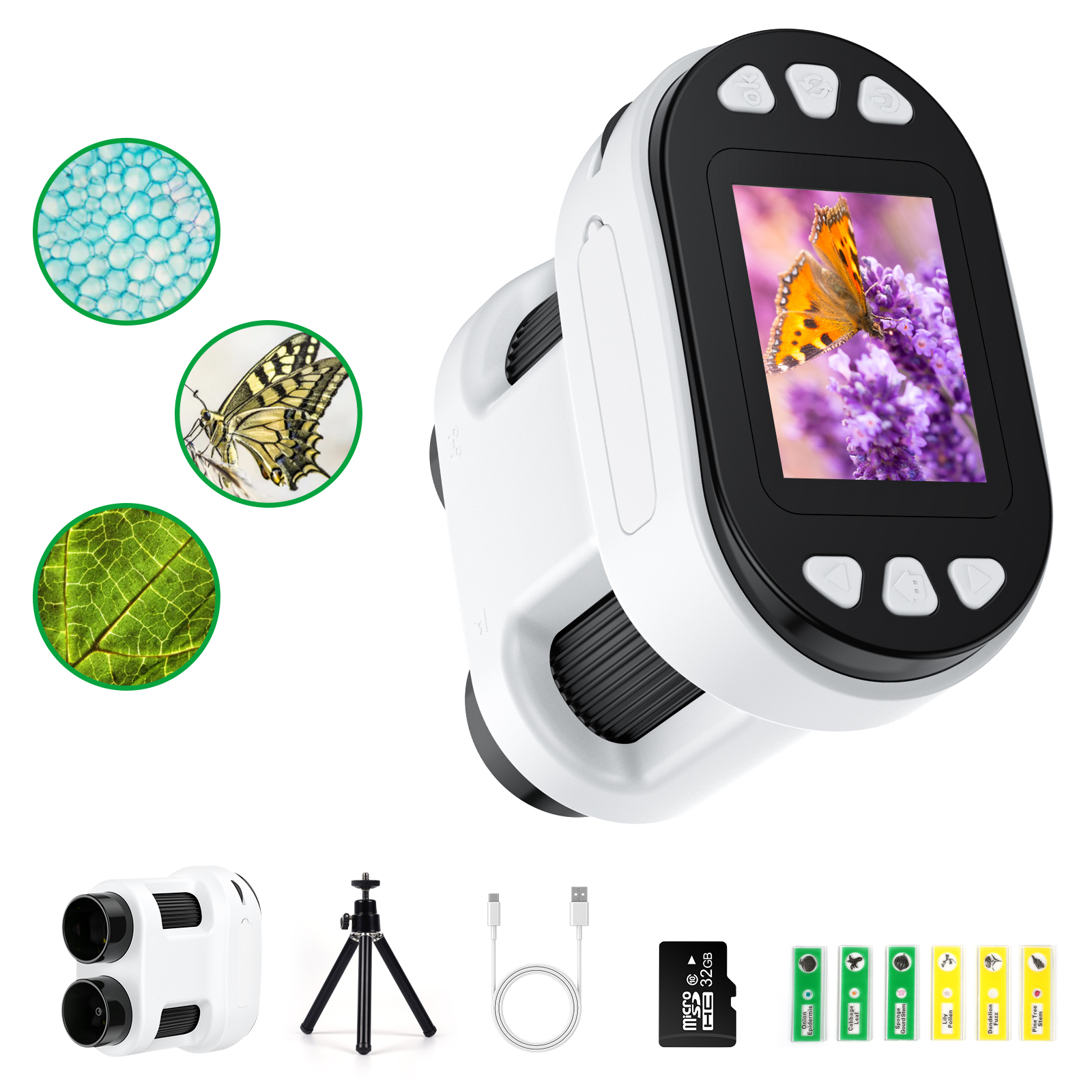 - 【32GB SD Card & Six Specimen Slides】This portable binocular microscope toy comes with a memory card that can save a lot of photos and videos. In addition, it includes six popular specimen slides commonly used in basic laboratory teaching education of entomology and botany, allowing children to open up a new world.